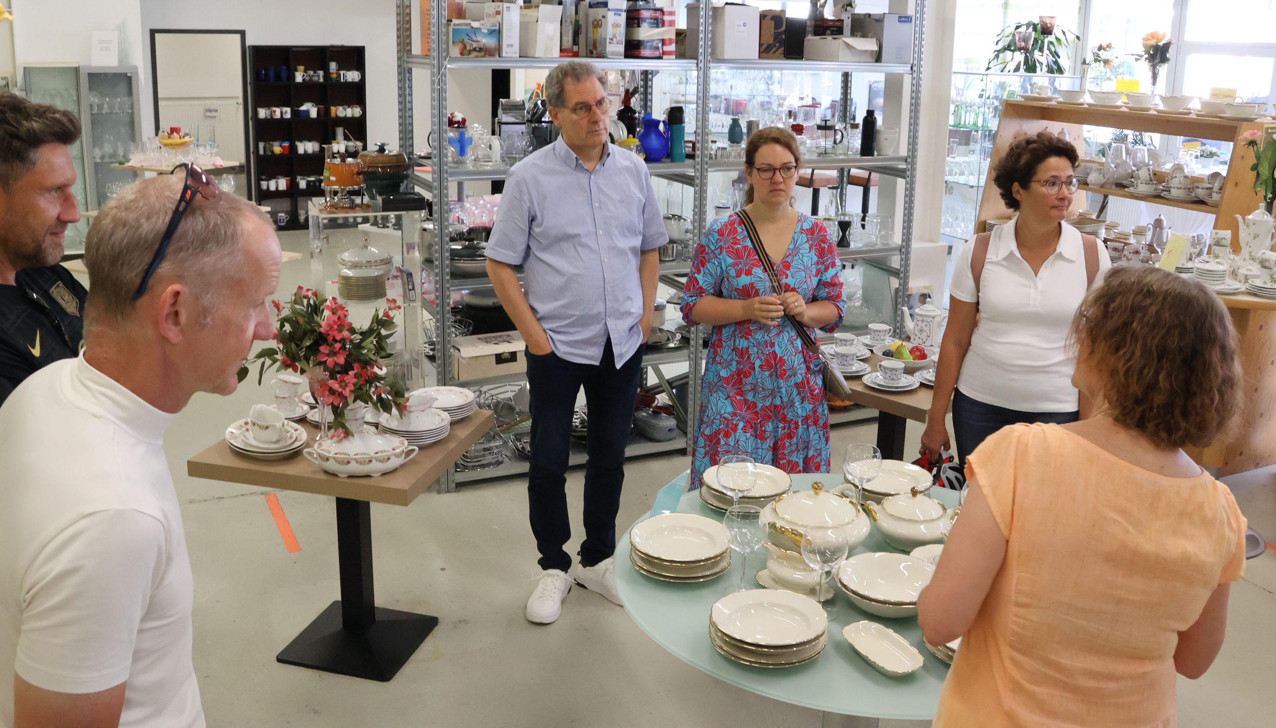 Preislich liege man im unteren Marktsegment, sagt Verena Schlossarek. Höhere Preise würden viele der Einkaufenden überfordern. Gut 50 Leute halten den Markt am Laufen, darunter viele Ehrenamtliche und – auch das ein großer Pluspunkt von Samt & Sonders XXL – Menschen mit erschwertem Zugang zum Arbeitsmarkt, die vom Jobcenter zugewiesen werden und sich hier in menschenfreundlicher Umgebung unter Anleitung in die neue Tätigkeit einarbeiten können. „Riesenrespekt“, fasst Markus Eisele die Reaktionen der Besuchsgruppe zusammen.