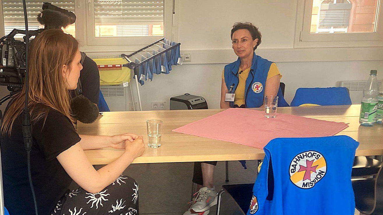 Barbara Bišický-Ehrlich ist selber gelernte TV-Journalistin, hier wird aber sie interviewt – als Ehrenamtliche der Bahnhofsmission. (Foto: Susanne Schmidt-Lüer)